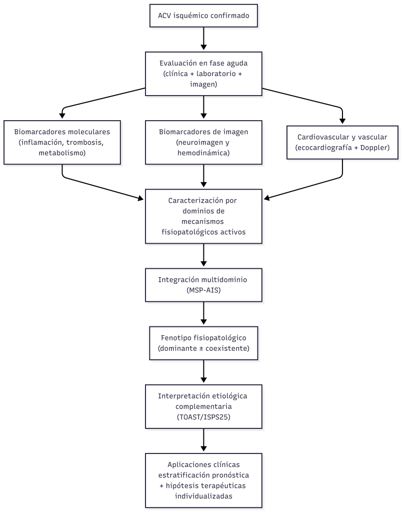 MSP-AIS (Multidomain Stroke Phenotyping in Acute Ischemic Stroke) es un marco clínico–fisiopatológico desarrollado desde una perspectiva de medicina traslacional y de precisión, diseñado para complementar las clasificaciones etiológicas tradicionales del ACV isquémico (p. ej., TOAST), integrando biomarcadores moleculares e imagenológicos que reflejan mecanismos fisiopatológicos activos durante la fase aguda.